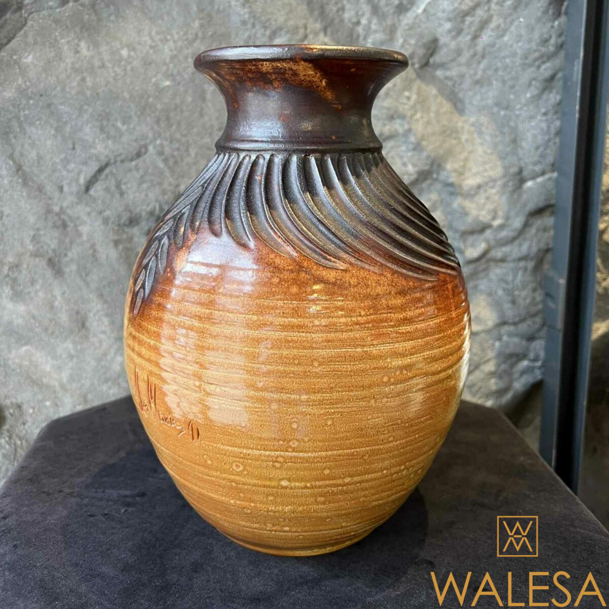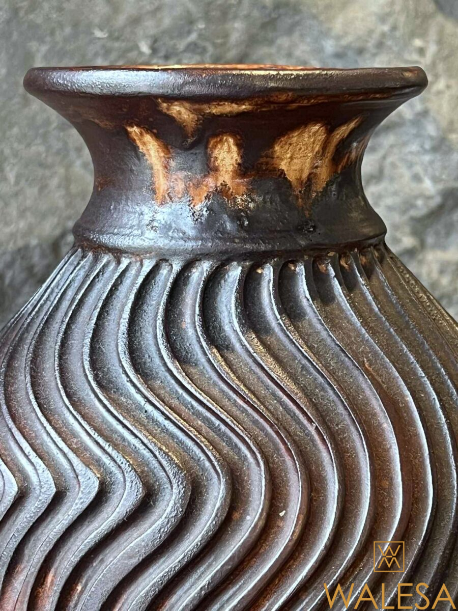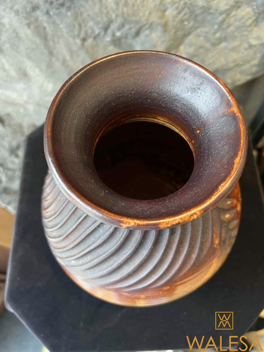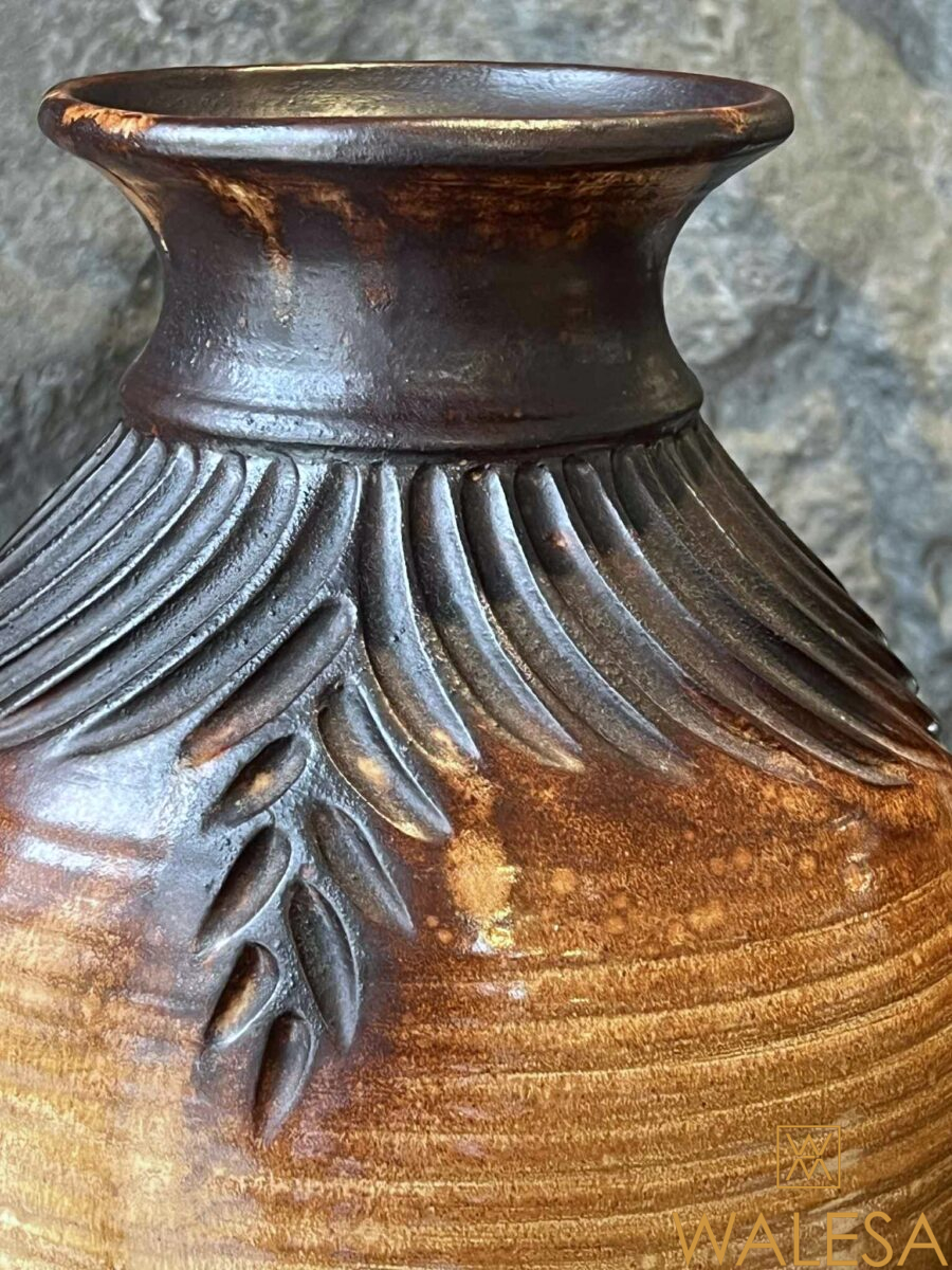 Exceptionnel vase balustre en terre cuite vernissée et à décor en relief à patine brune.