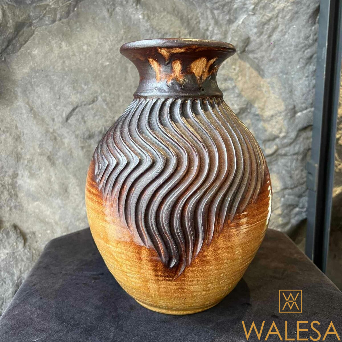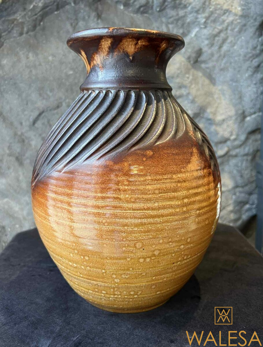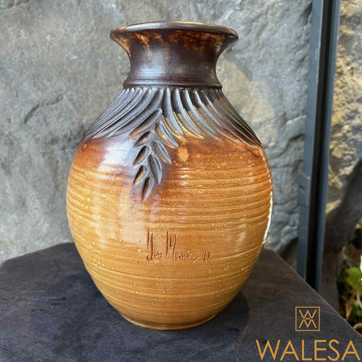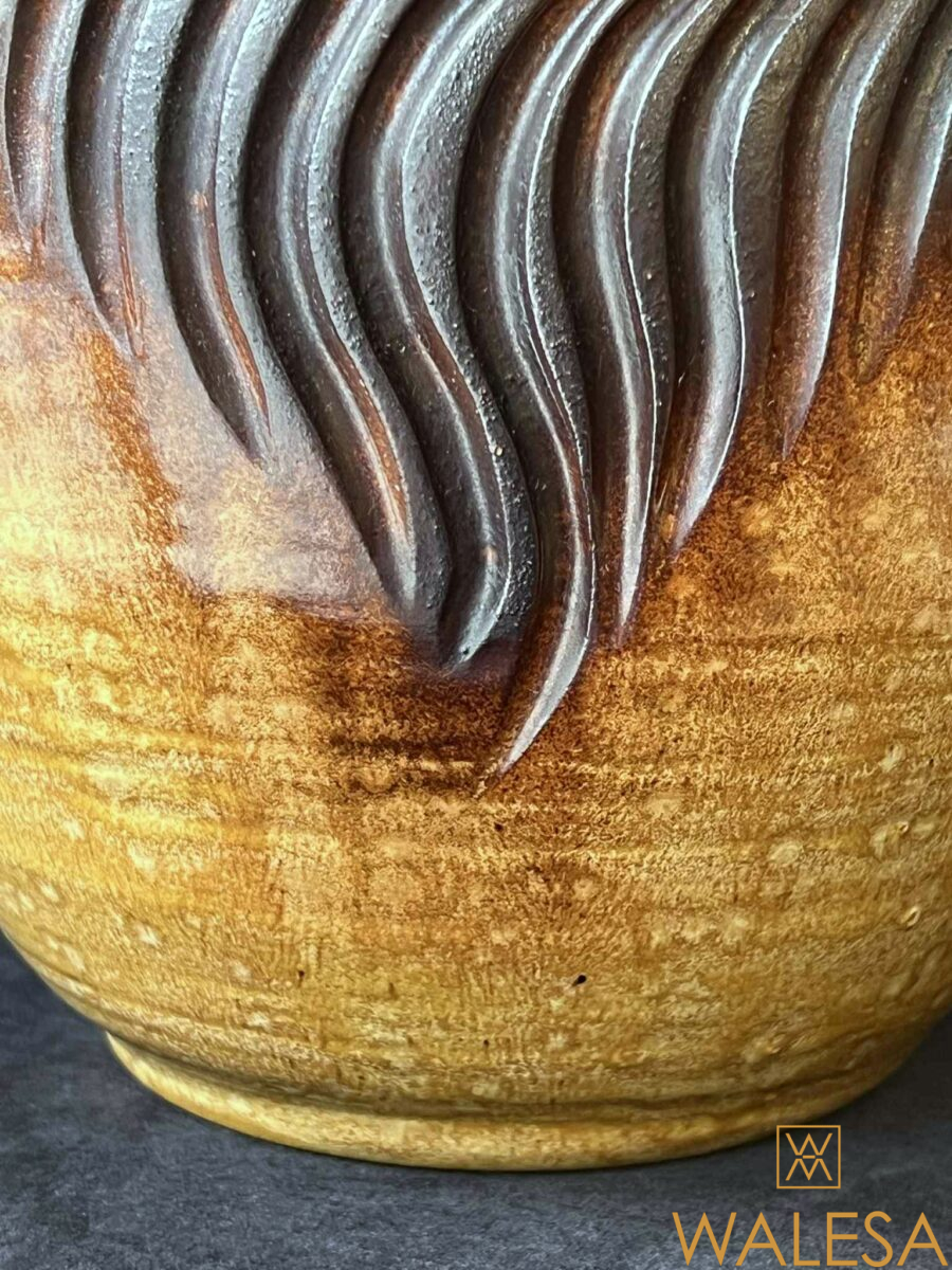 Exceptionnel vase balustre en terre cuite vernissée et à décor en relief à patine brune.
