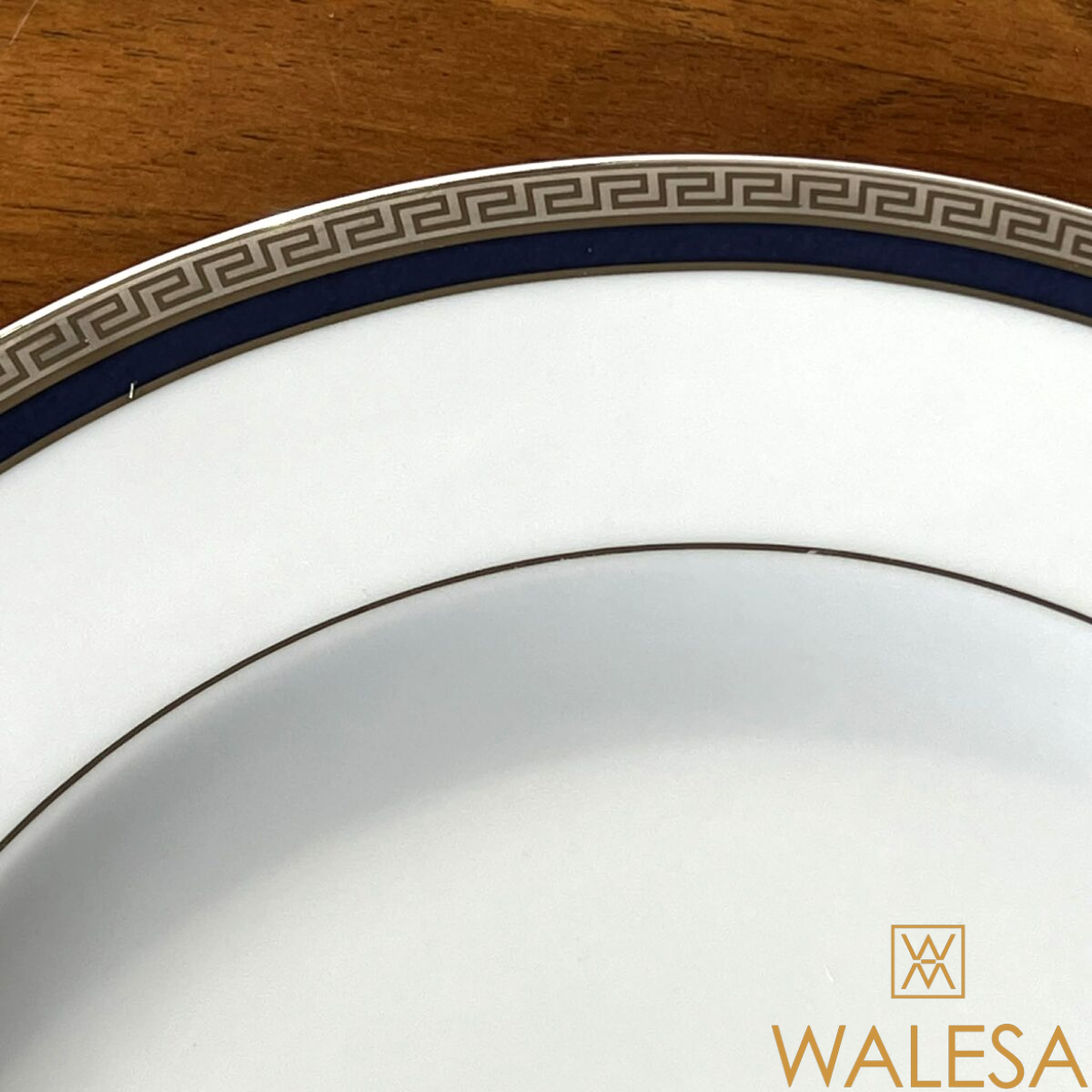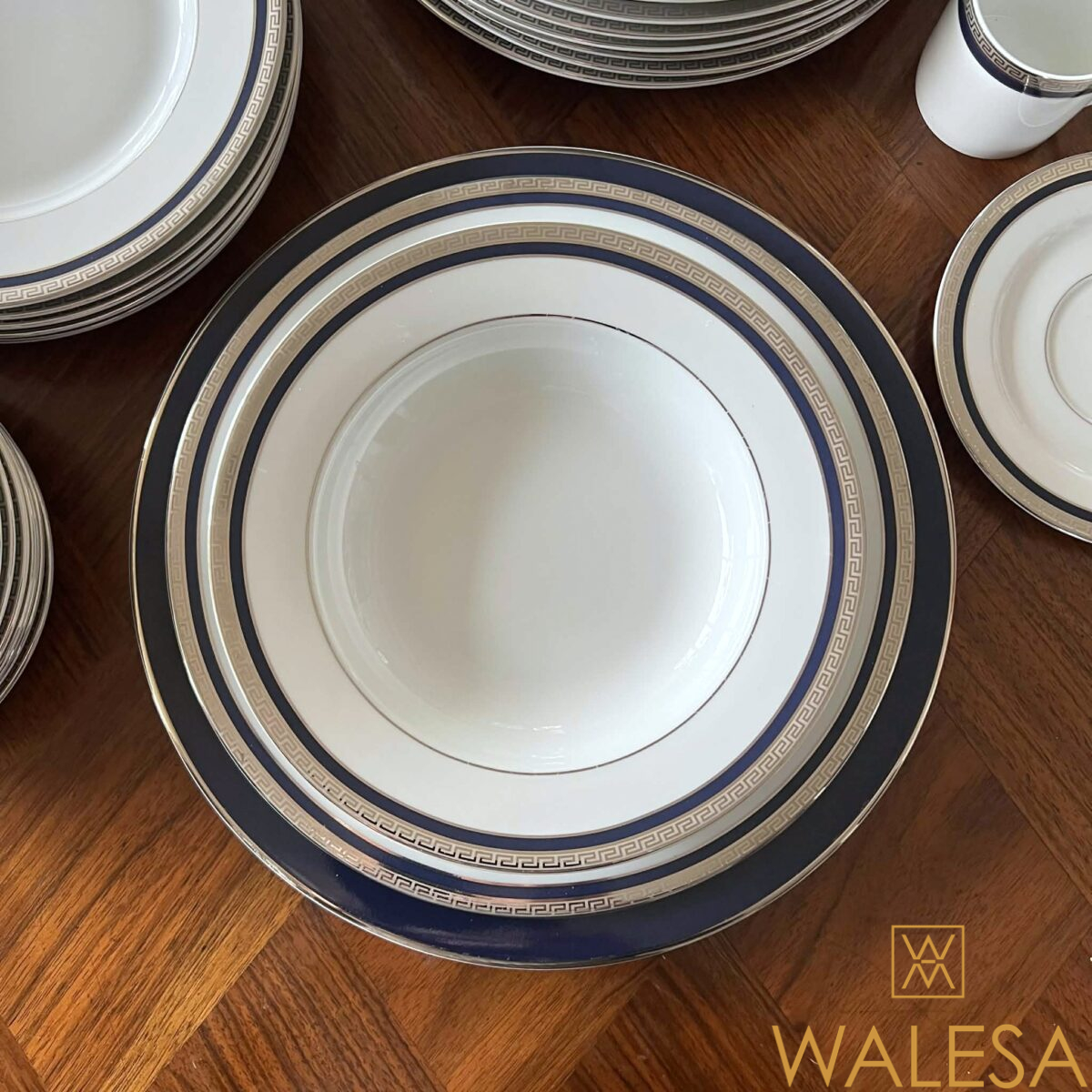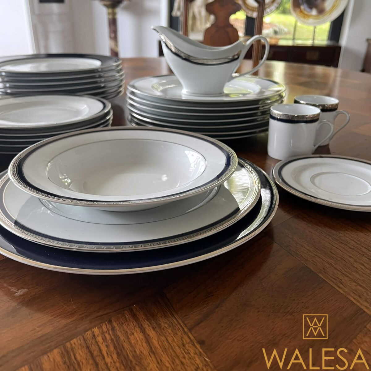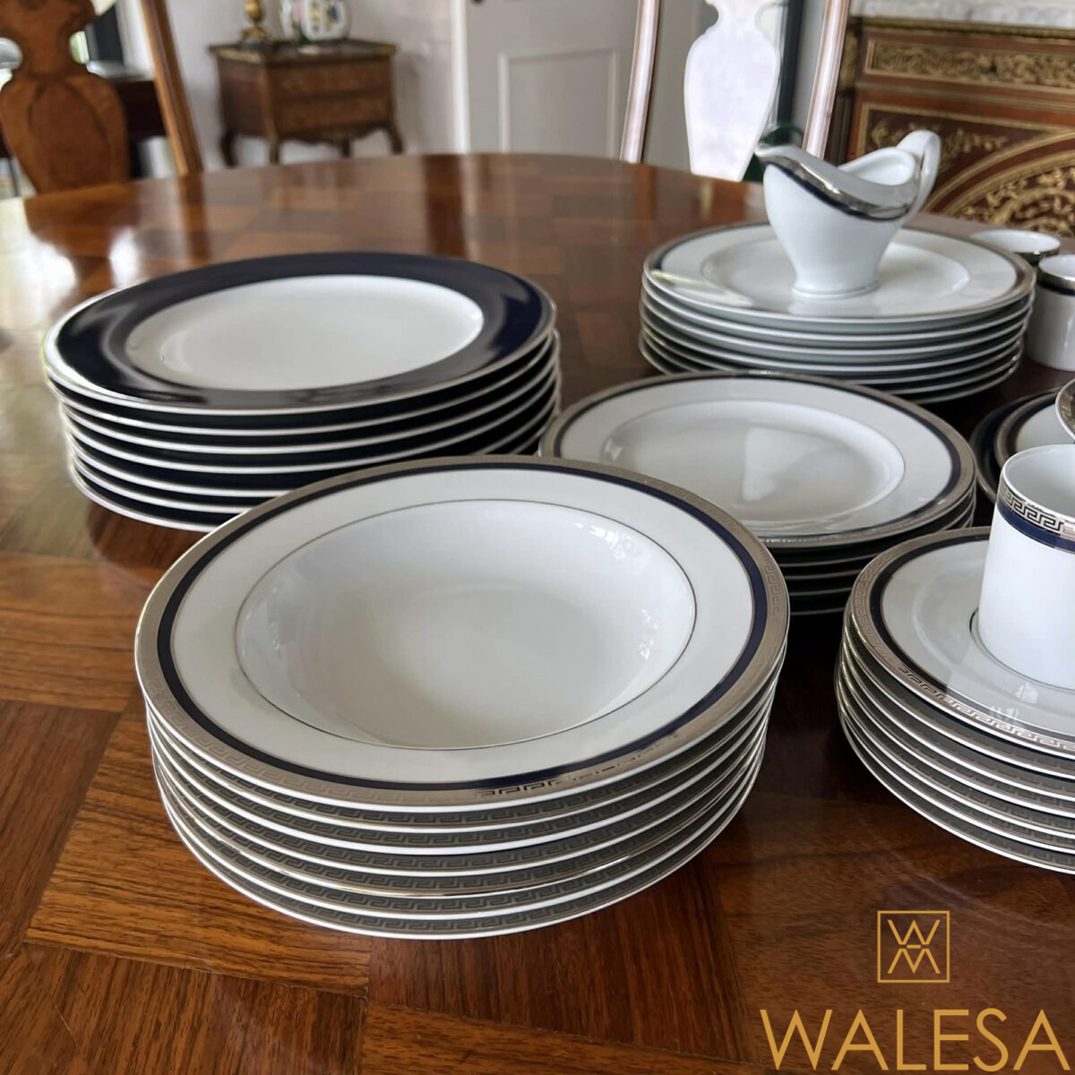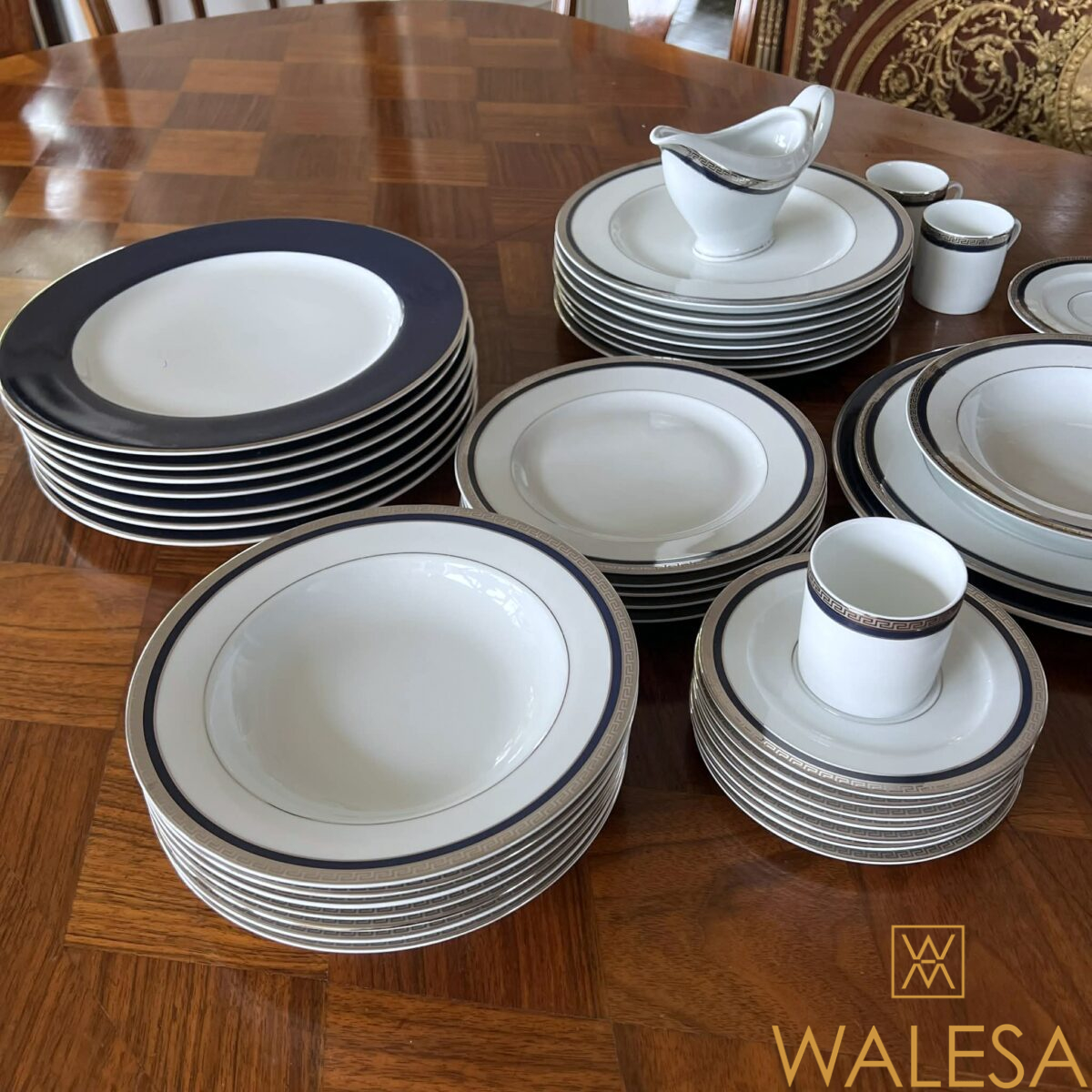-41 pièces- en porcelaine blanche à décor d’un bord bleu cobalt et de liserés à motif “de grecques” argentés.
