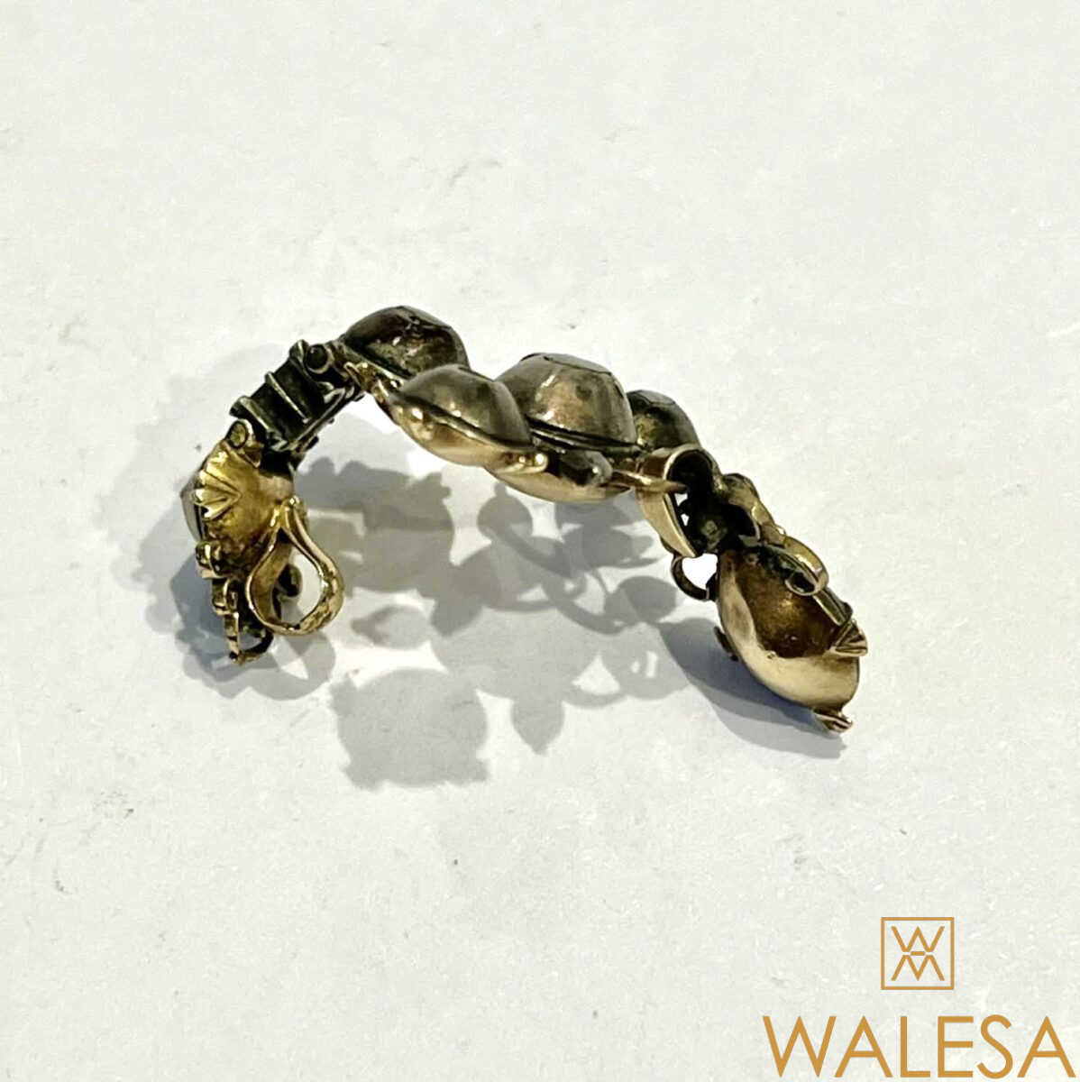 En or au dos (pour empêcher de noircir les vêtements), argent et diamants.