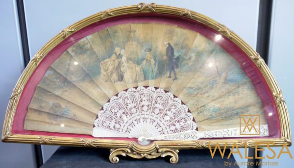 Eventail en ivoire dans un cadre vitrine en bois doré de style Louis XVI