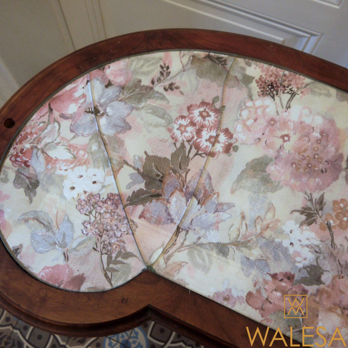 En noyer à 3 tiroirs, tablette garnie d’une toile fleurie et d’un vitrage (accidenté)