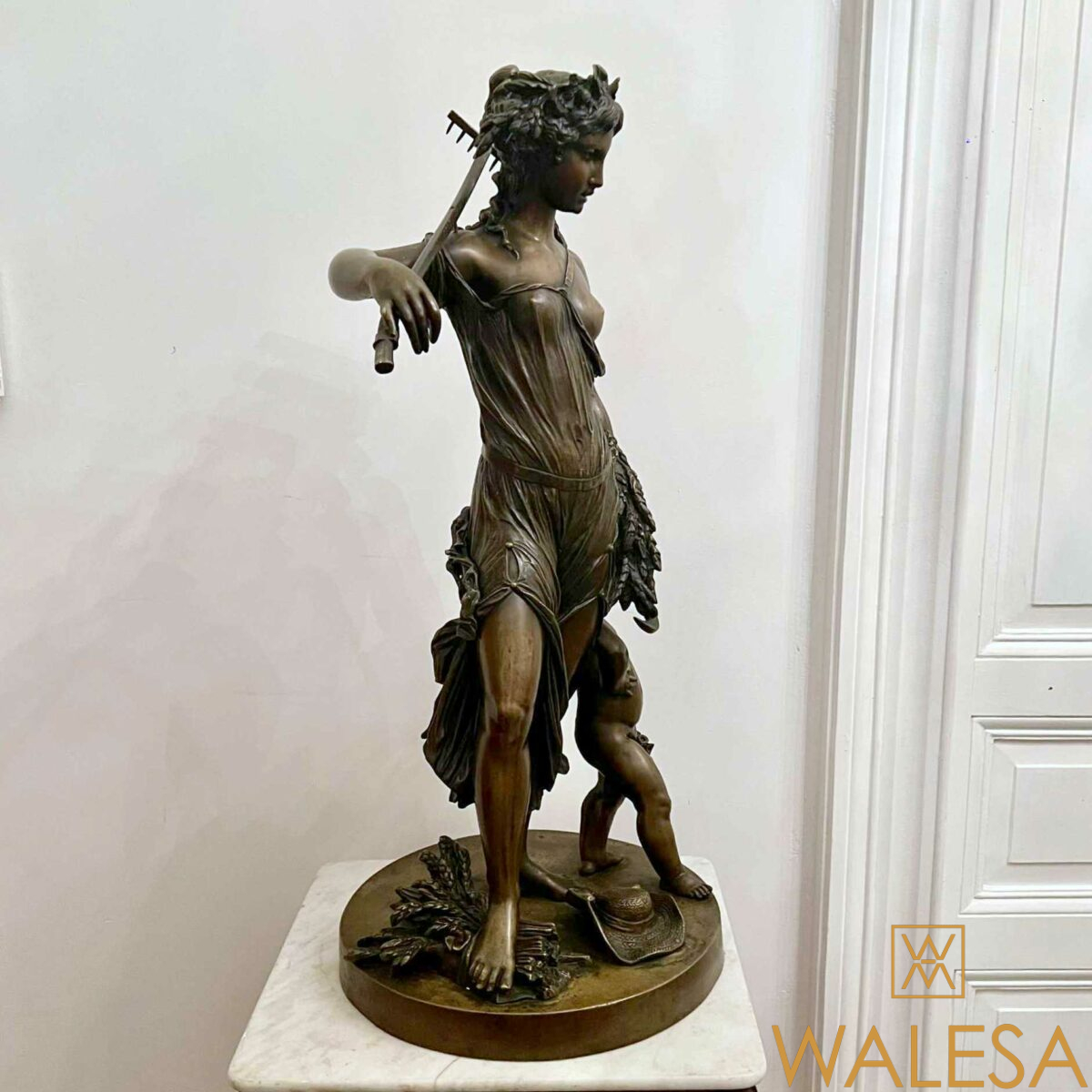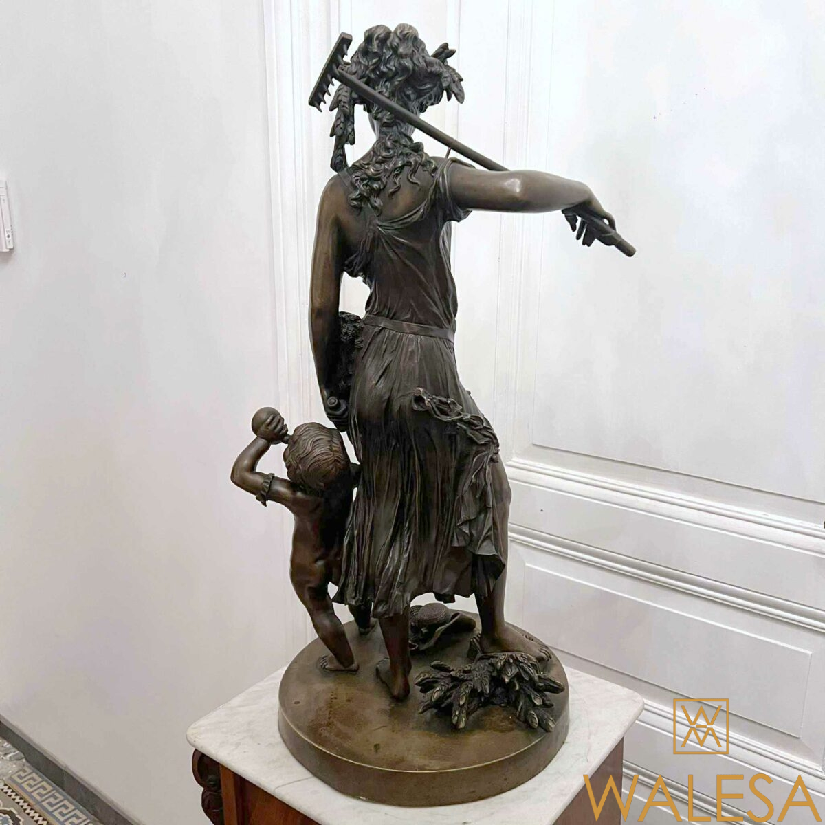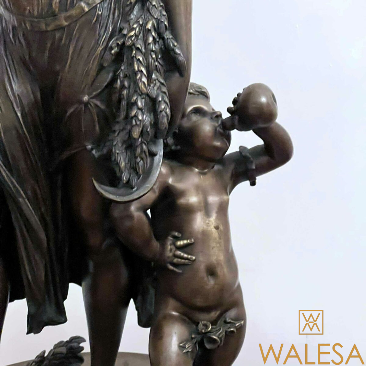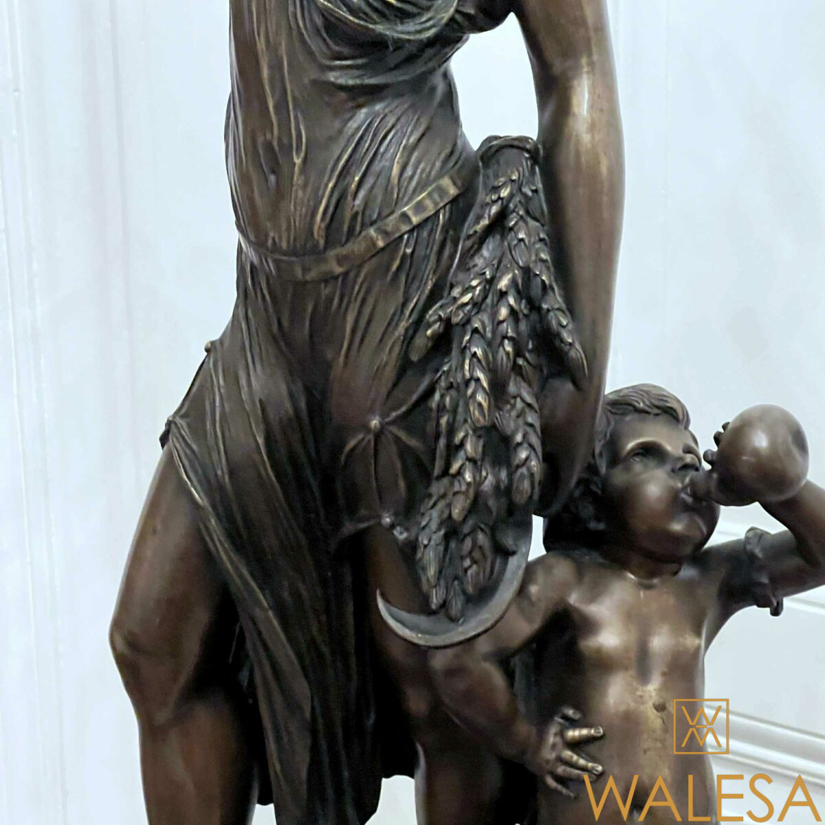 Grande sculpture « Jeune femme et Bacchus enfant » en bronze à patine brune nuancée.