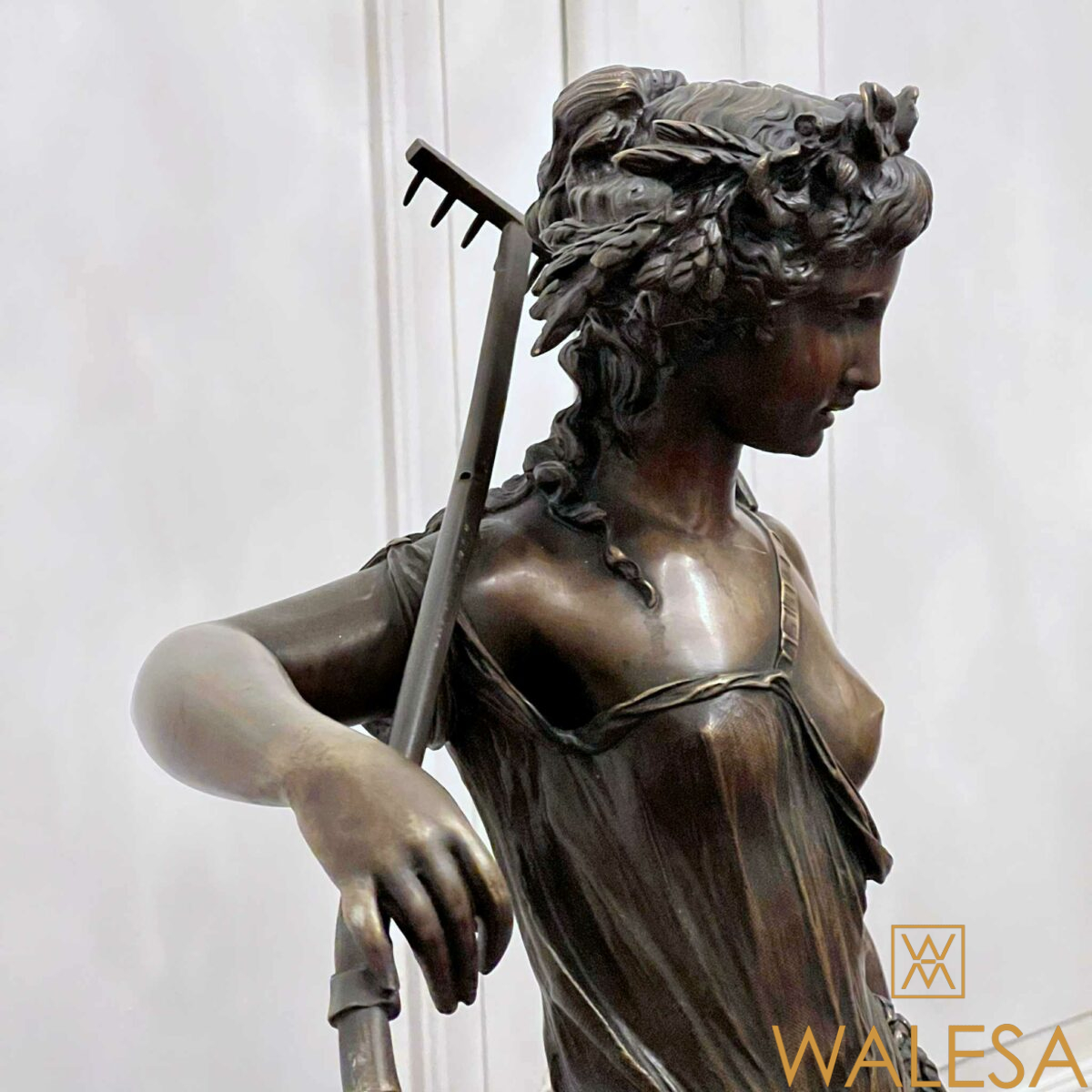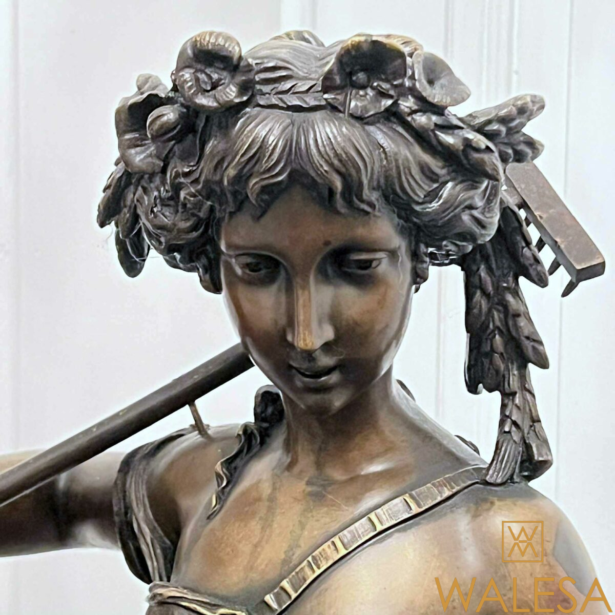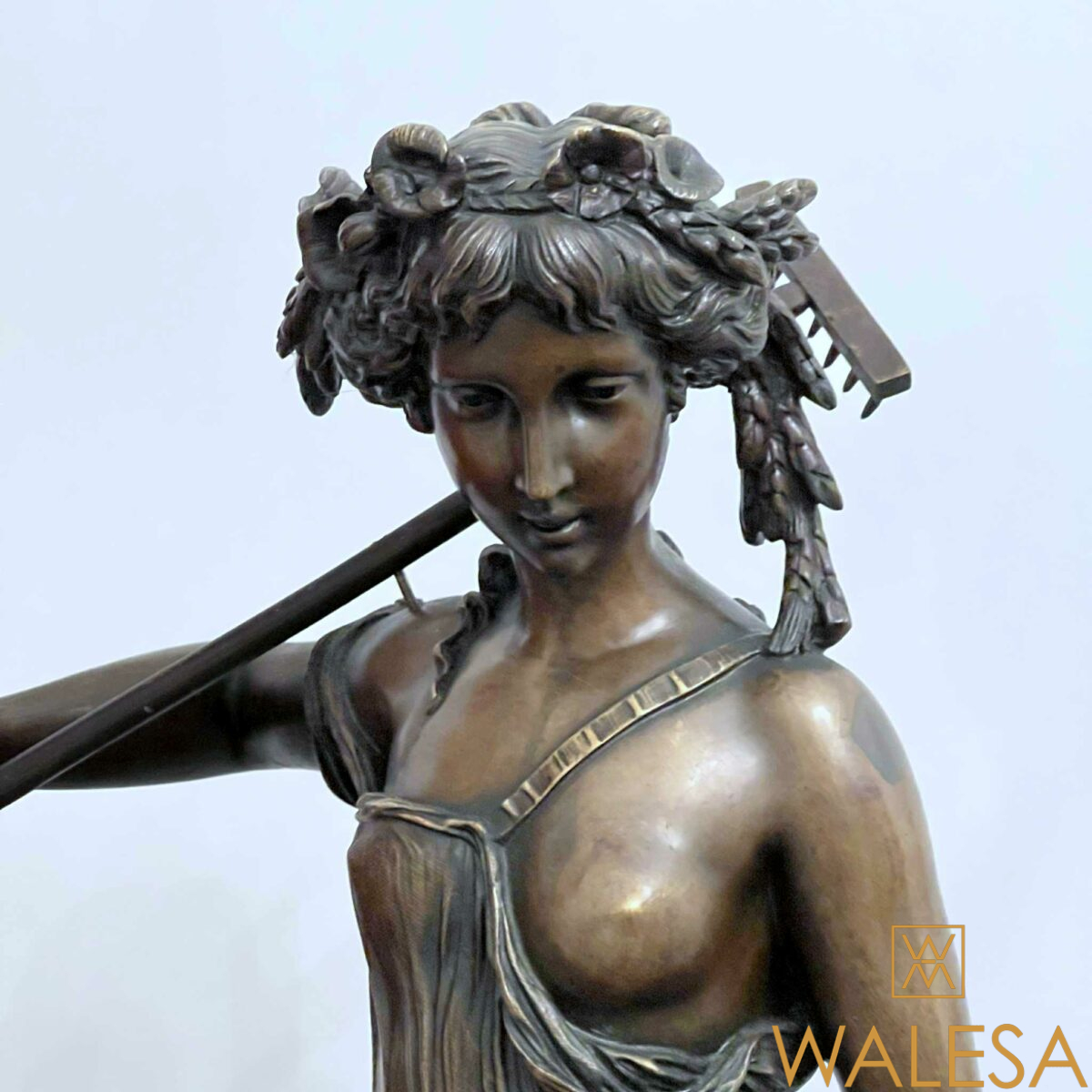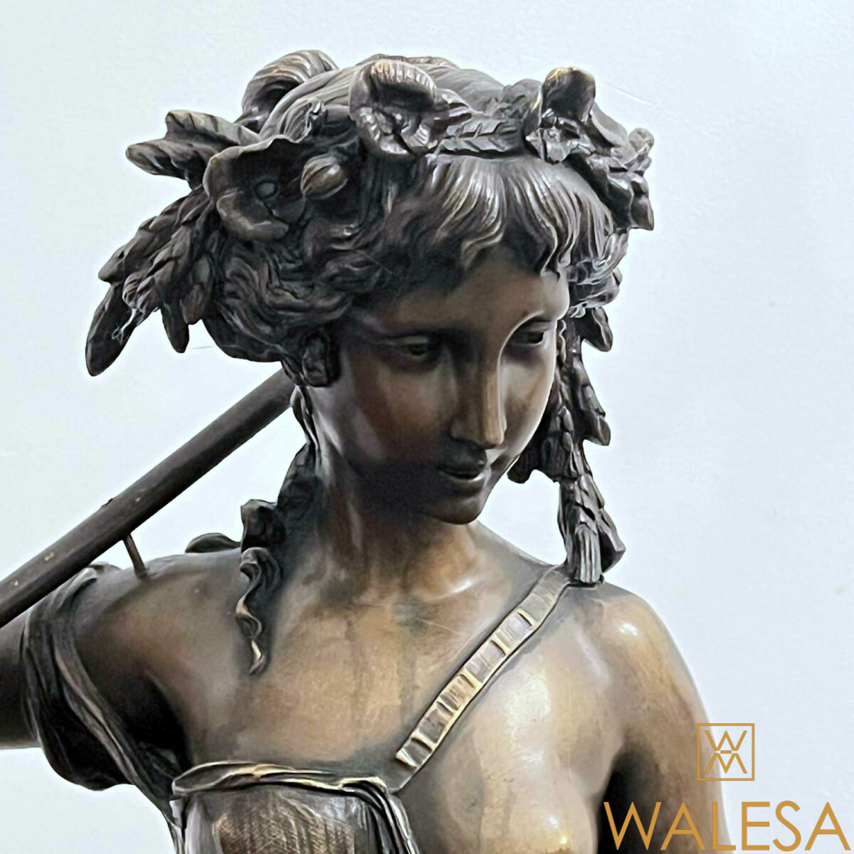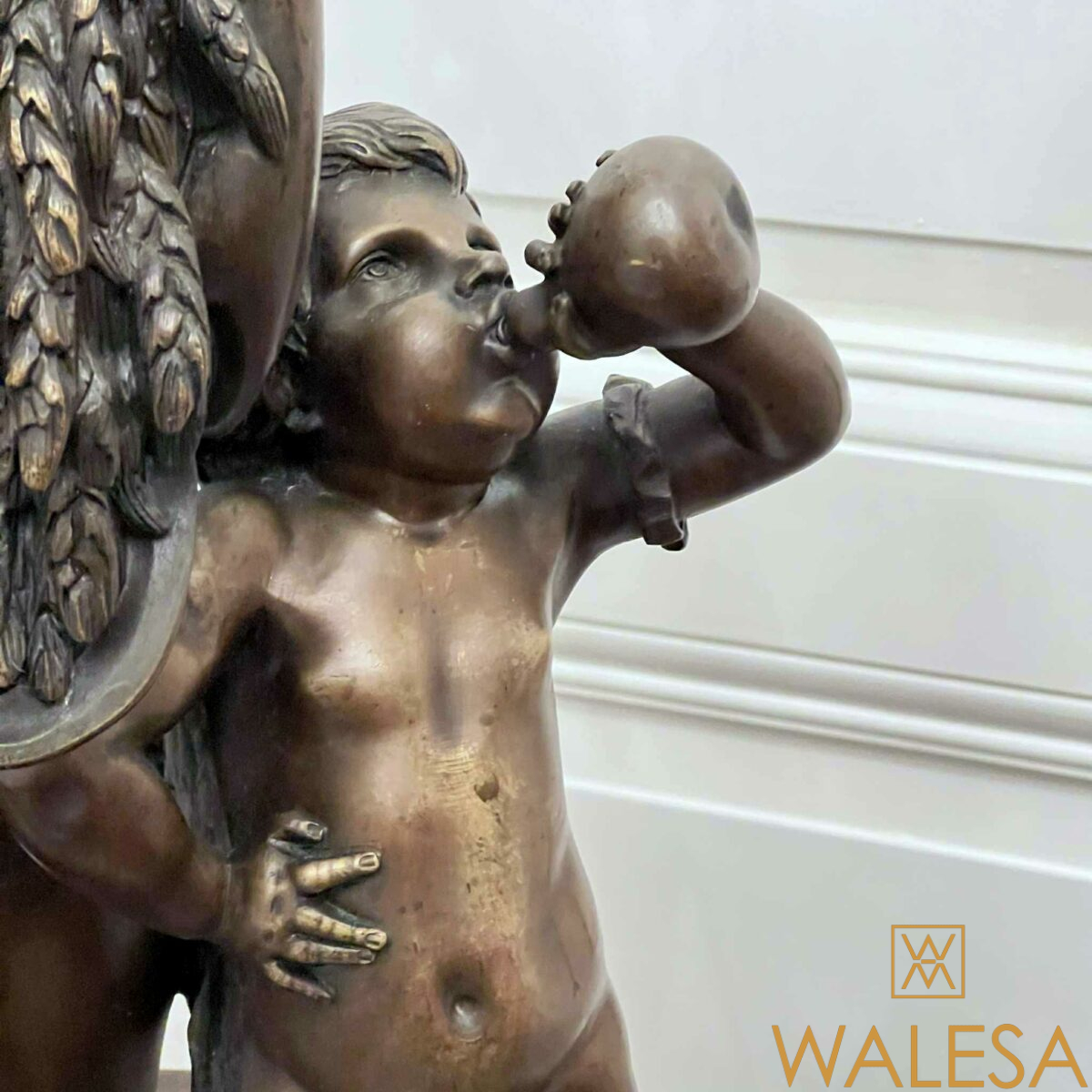 Grande sculpture « Jeune femme et Bacchus enfant » en bronze à patine brune nuancée.
