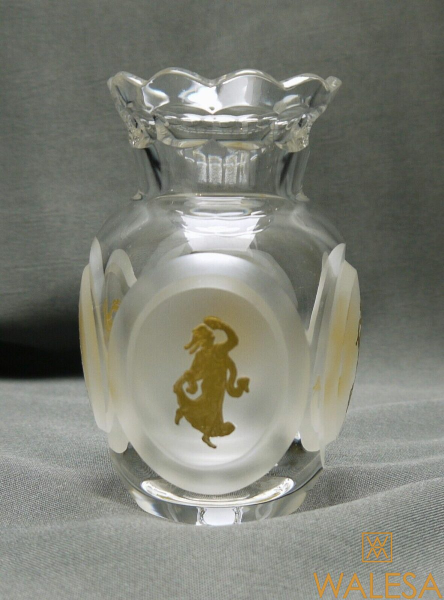 Petit vase en cristal clair à médaillons en cristal satiné décor à l’or Danse de Flore et col festonné.