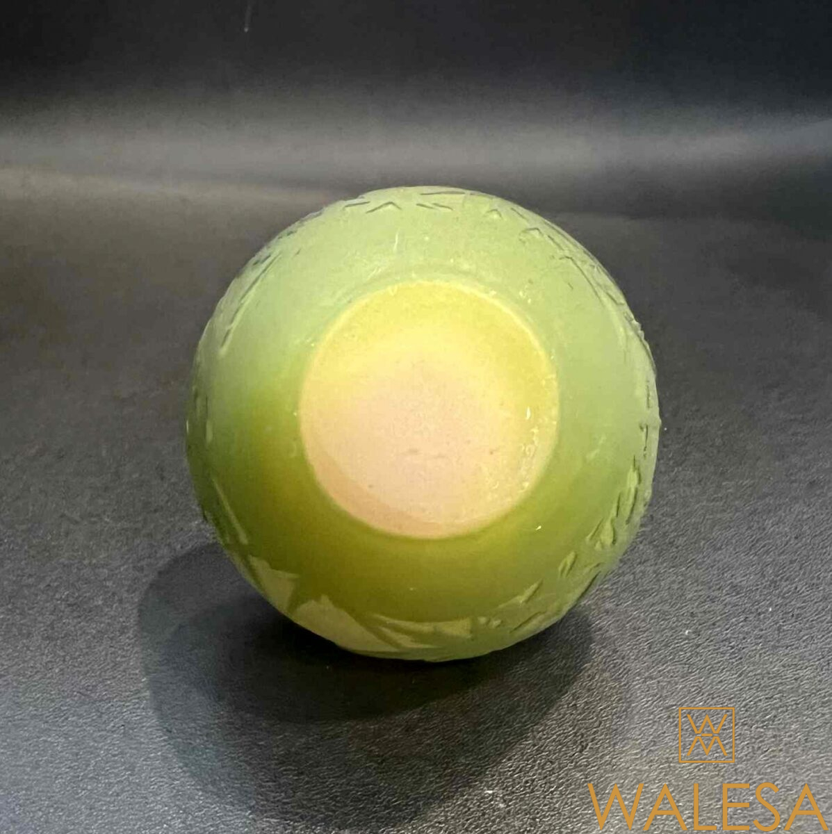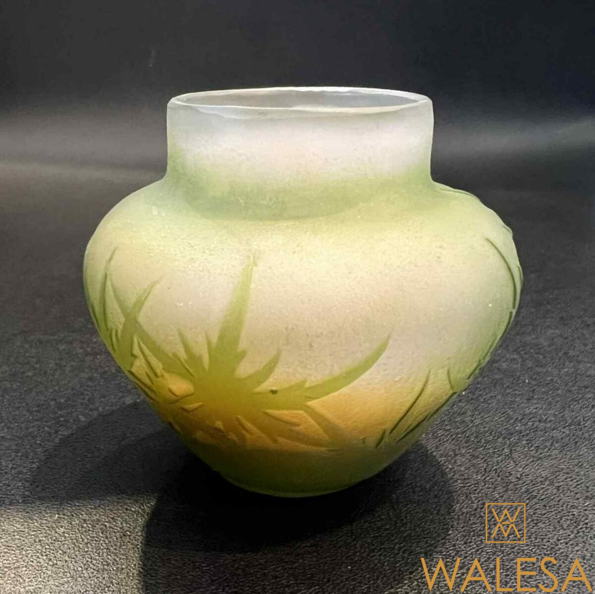 Petit vase en verre incolore partiellement rose saumoné et vert à décor de chardons en fleurs gravé à l’acide sur le fond dépoli.