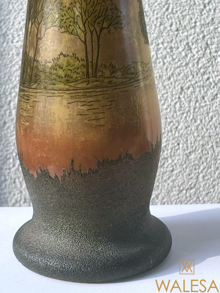 de style Art Nouveau à décor d’un paysage lacustre dégagé à l’acide et peint à l’émail.