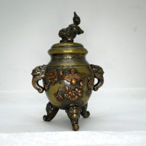 Japon Pot couvert en bronze tripode ciselé et incrustations de cuivre